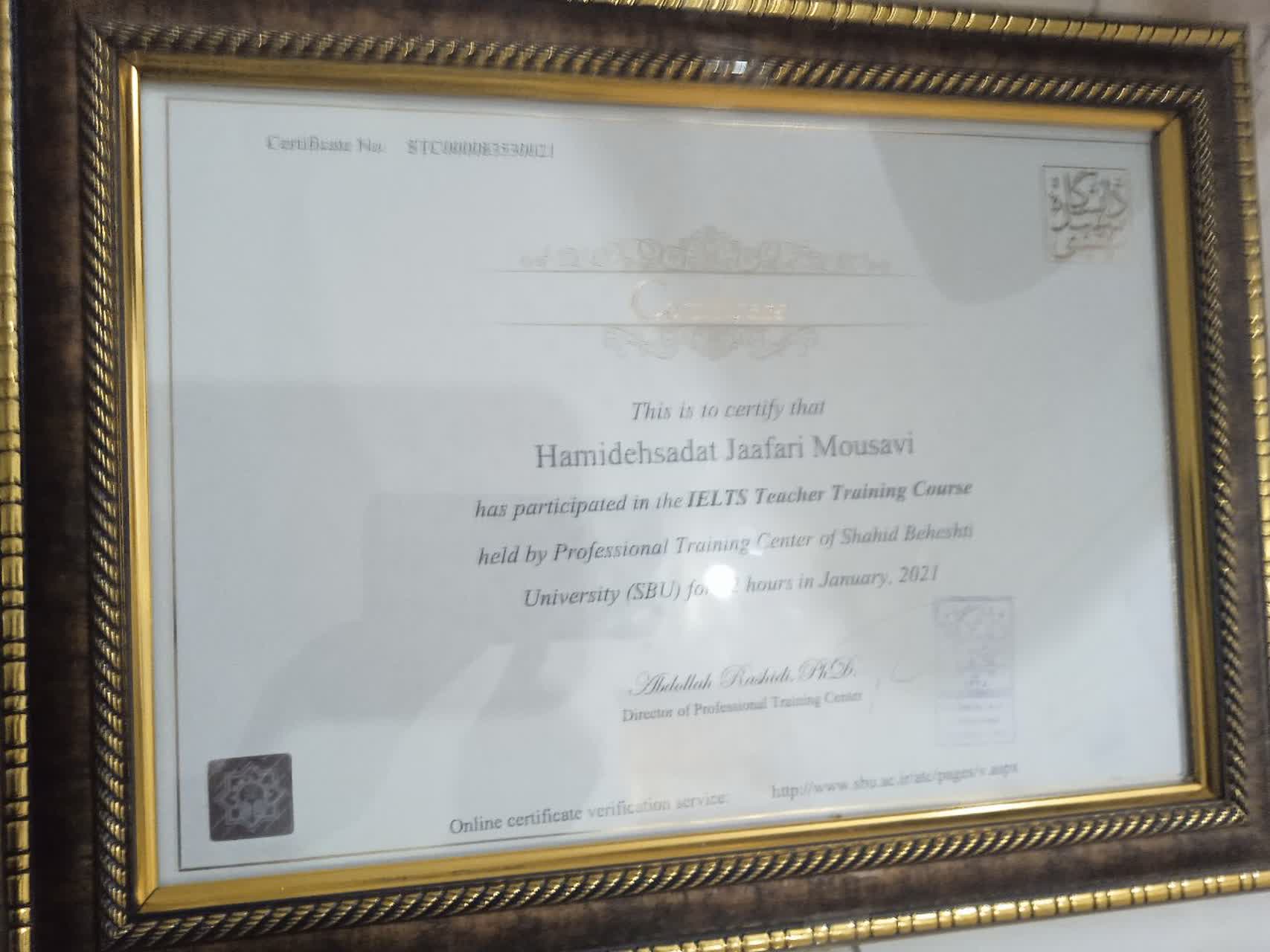 خانم حمیده جعفری موسوی( گواهی نامه شرکت در دوره تربیت مربی آیلتس)